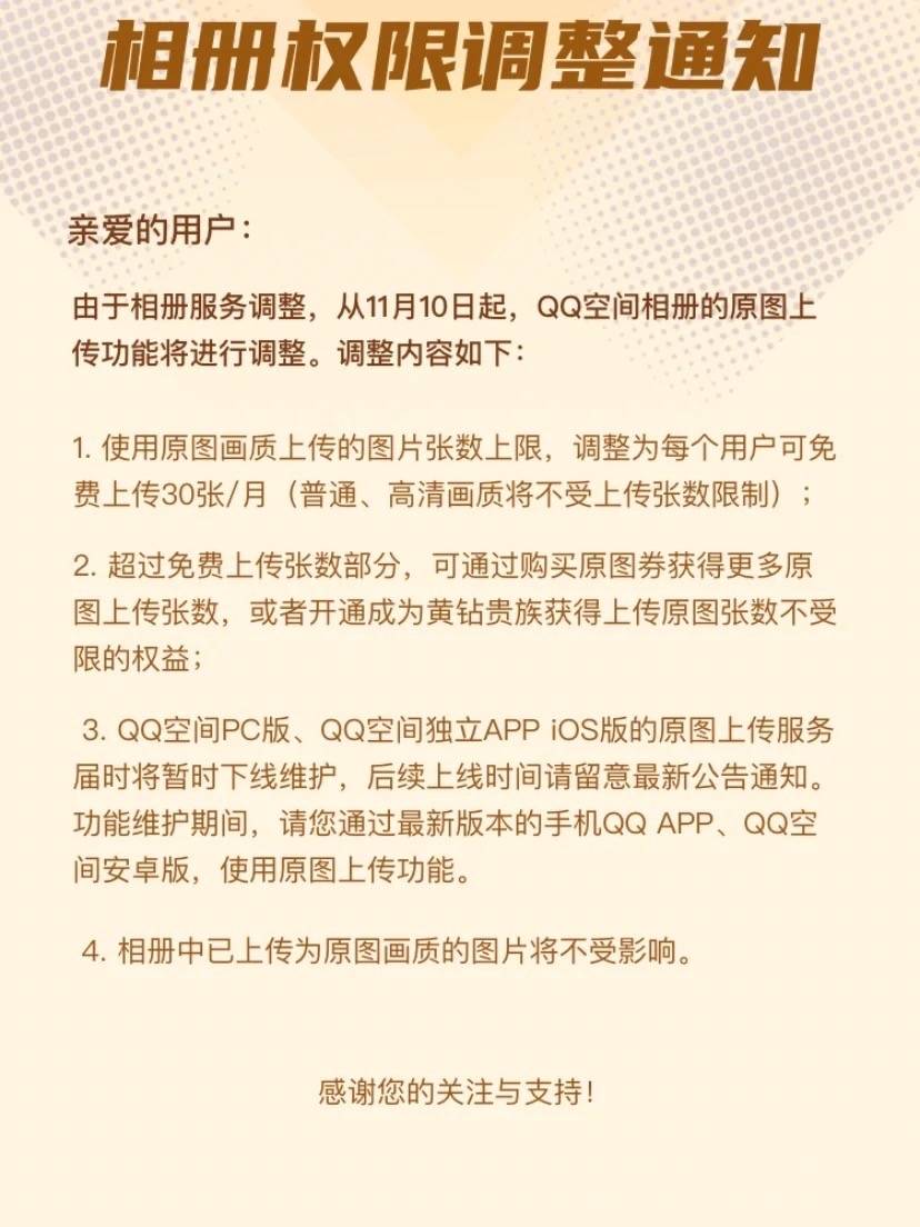 QQ空间原图上传功能调整,每月超30张原图上传需付费购买原图券或开通黄钻。后续还将调整: