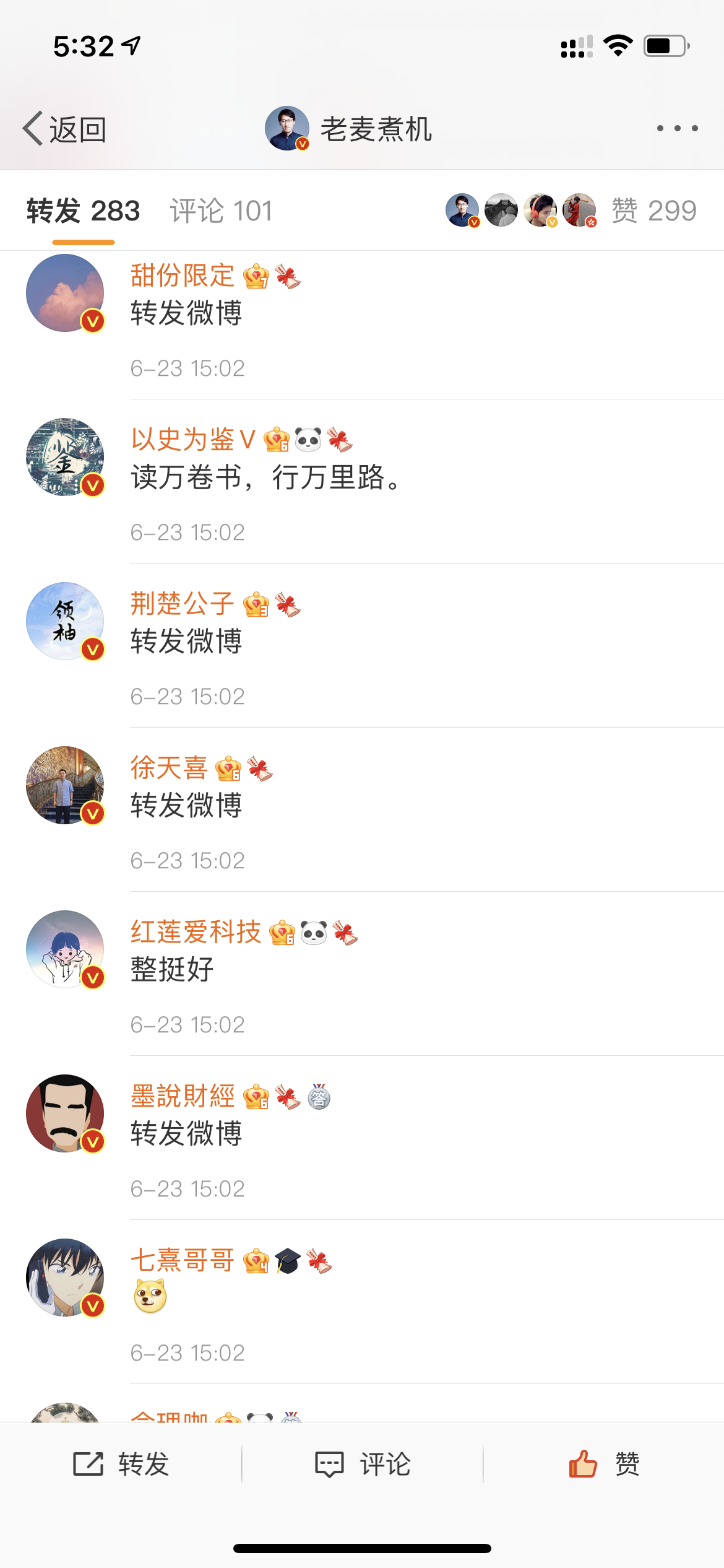 昨天试了一下微博的大 V 任务功能,花了 1500 块,要求 50 个 50 万粉丝以上的大V 转发,每人分 30 块。一瞬间就转完了,然后阅读量从 160 万变成了今天的 250 万,你说可怕不可怕?这大 V 和数据多不值钱。