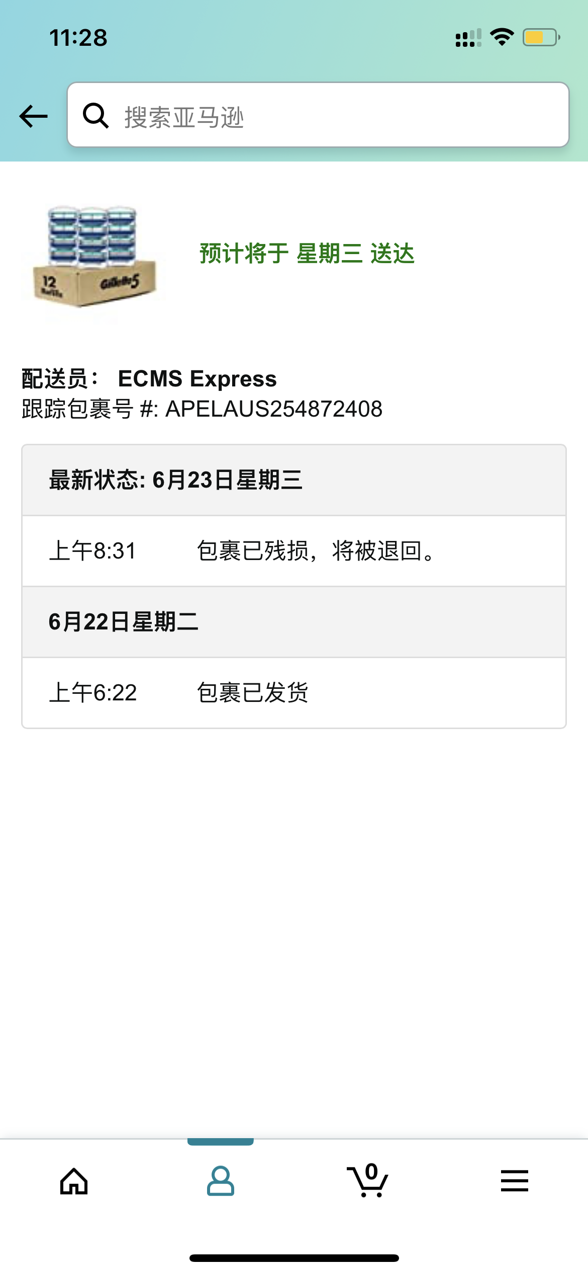 买了剃须刀刀片,6月23日就提示包裹有破损了,这10天亚马逊没给我退款也没联系,直到我想起来看了眼物流才发现…