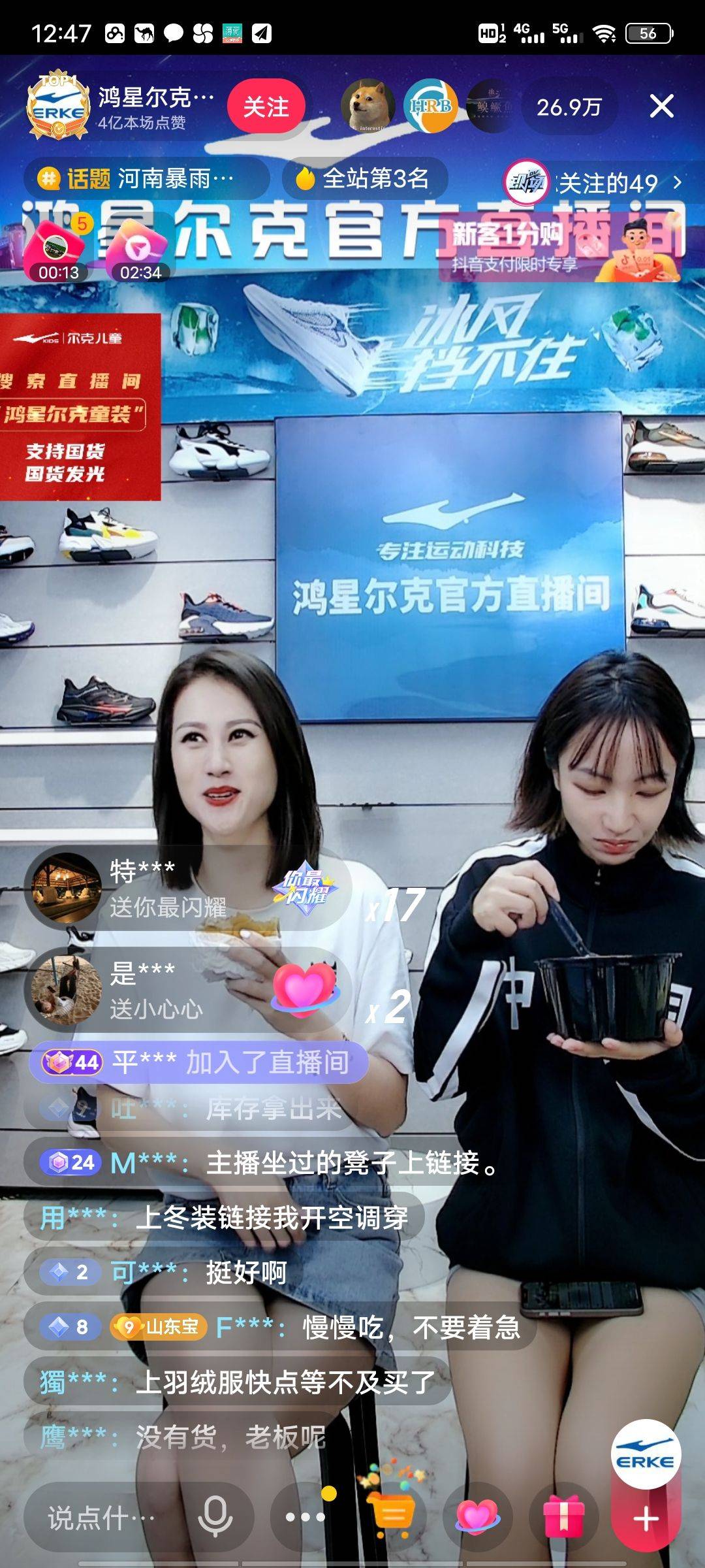 其它直播间带货的主持都在喊得脖子青筋爆现,鸿星尔克的直播间两主持人一边吃午餐一边唠嗑,因为这些东西都是粉丝直接发到办公楼下的……