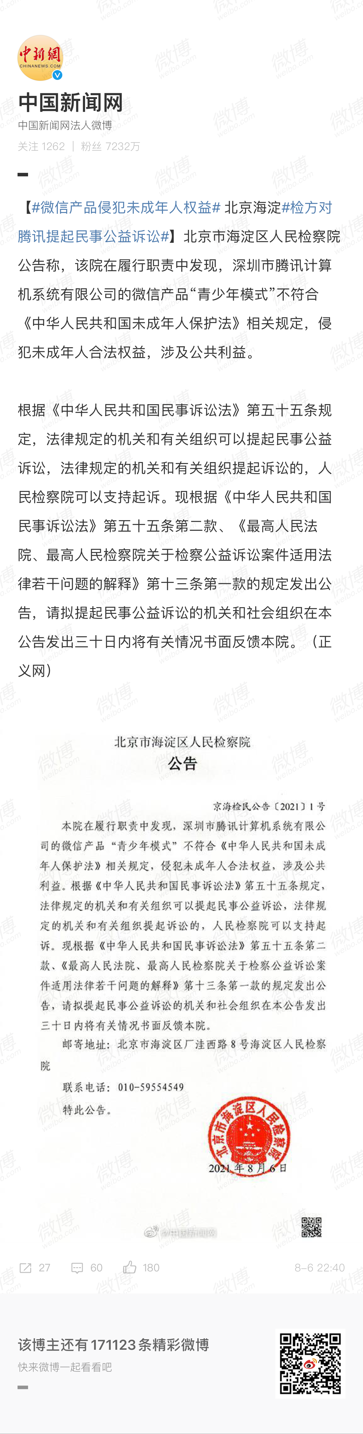 北京市海淀区厂洼西路8号海淀区人民检察院公告称,该院在履行职责中发现,深圳市腾讯计算机系统有限公司的微信产品“青少年模式”不符合《中华人民共和国未成年人保护法》相关规定,侵犯未成年人合法权益,涉及公共利益。现发出公告,请拟提起民事公益诉讼的机关和社会组织在本公告发出三十日内将有关情况书面反馈本院。