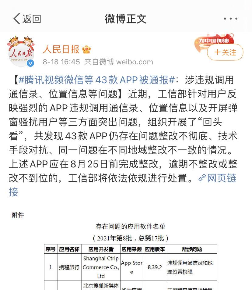 工信部针对于违规调用用户通讯录和地理位置的APP进行了第一轮整治后,腾讯视频微信等大厂APP整改不彻底,甚至采取技术对抗等方式。