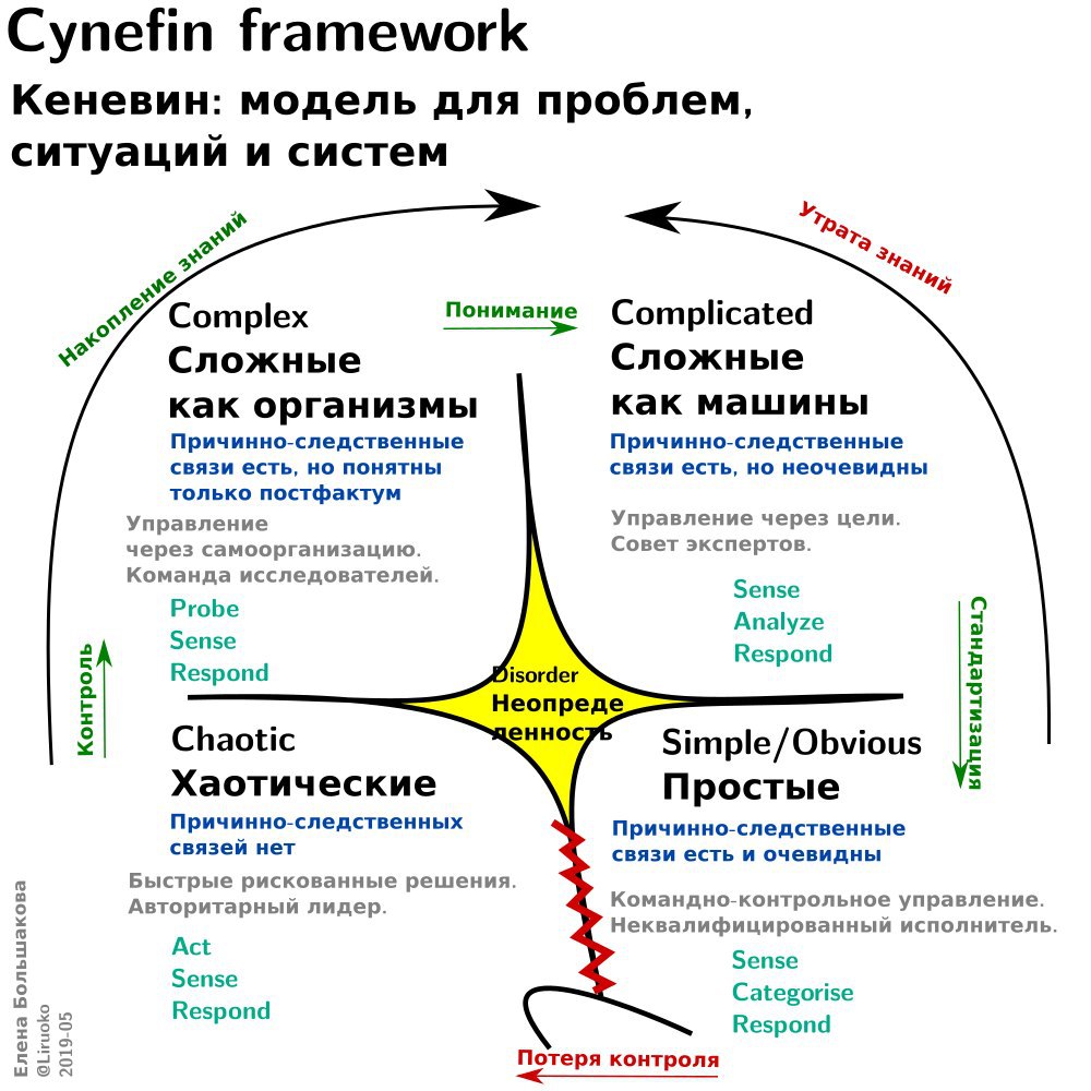 Cynefin – это способ думать о системах, сложных по-разному. Модель придумал примерно в 2000 году человек по имени Дейв Сноуден. Тогда он работал в IBM и занимался вопросами управления знаниями (knowledge management). Сейчас у Дейва своя консалтинговая компания, Cognitive Edge.