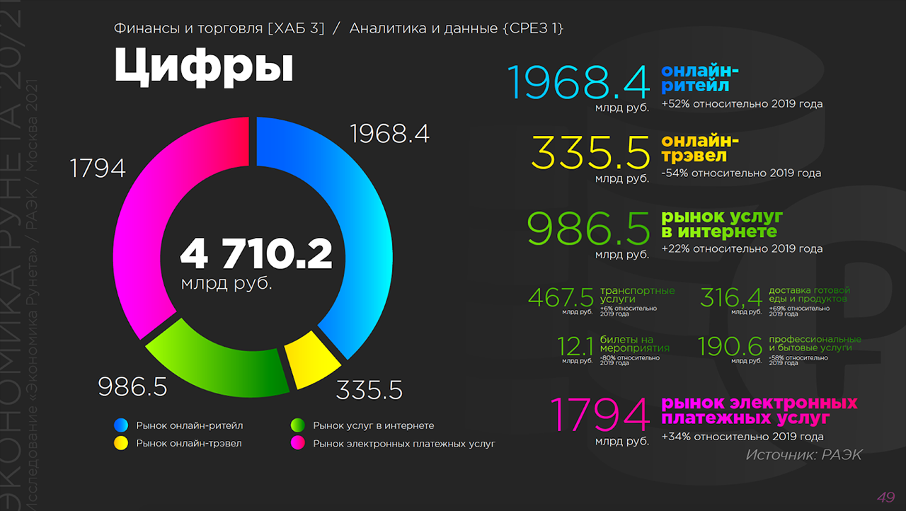 На 11% по сравнению с 2019 годом вырос сегмент маркетинга и рекламы (349,8 млрд. рублей), на 22% вырос сегмент электронной коммерции (6,07 трлн рублей), на 20% вырос инфраструктурный сегмент (152,3 млрд рублей), по сравнению с 2019 годом на 44% вырос и сегмент цифрового контента (123,4 млрд рублей). В целом экономика Рунета выросла на 22%.