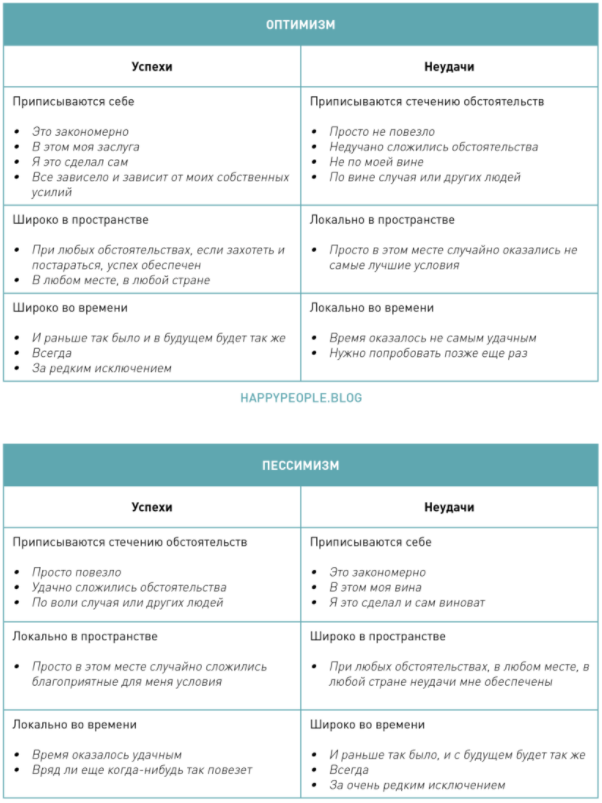 Оптимисты возлагают вину за плохие события на внешние причины, в то время как пессимисты винят себя, поэтому оптимисты в общем более уверены в себе. Оптимисты воспринимают позитивные события как свою заслугу, в то время как пессимисты случайное стечение обстоятельств.