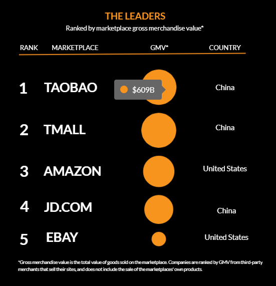 По данным портала Digital Commerce 360, в 2020 году на онлайн-маркетплейсы приходилось 62% мировых интернет-продаж — в общей сложности за год там были проданы товары на $2,7 триллиона. Топ-3 маркетплейсов в мире — китайские Taobao и Tmall, а также американский Amazon, на них приходится около двух третей всех таких продаж.