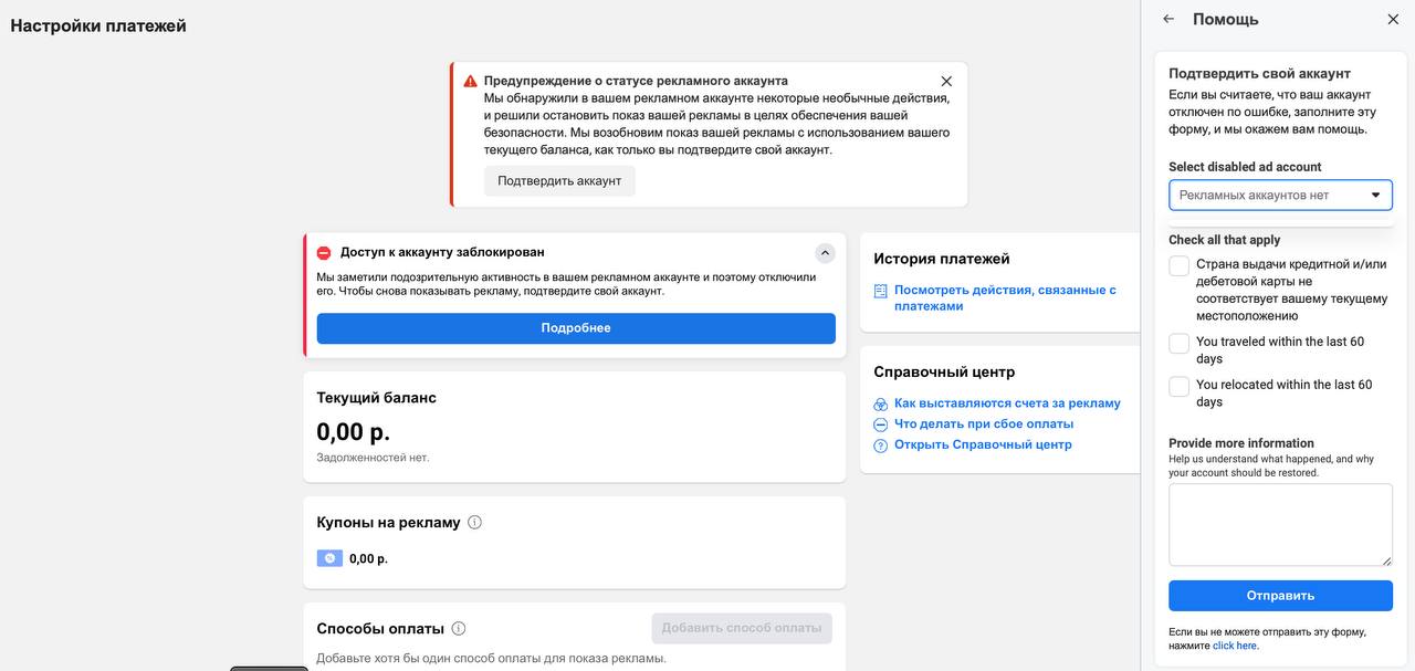 Если у вас по каким-то непонятным причинам, заблокировали платёж в рекламном кабинете и стоит уведомление, что нужно ПОДТВЕРДИТЬ АККАУНТ, но выбрать его для отправки запроса не удаётся, воспользуйтесь ссылкой ниже ⬇️