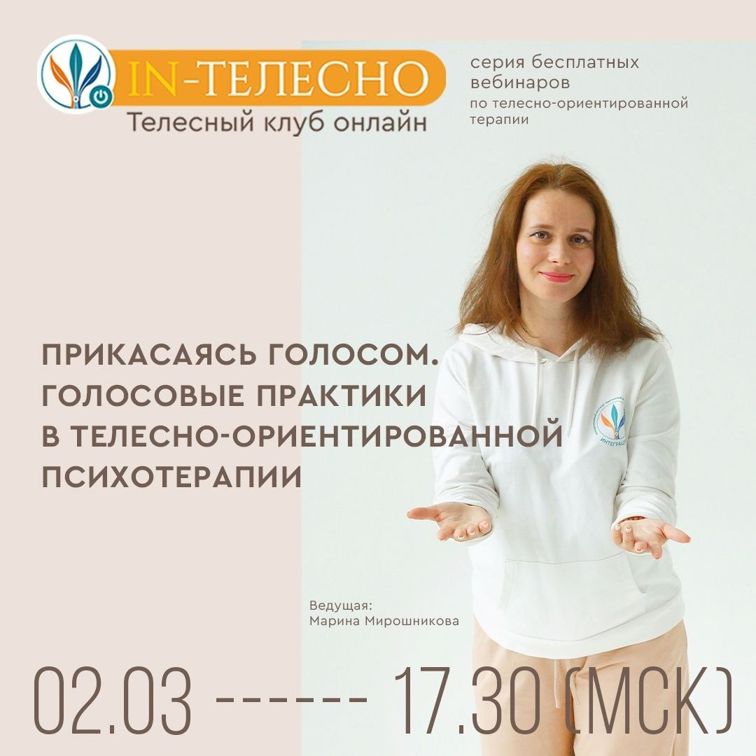 🎯 Ждем вас на бесплатном вебинаре 2 марта в 17.30 мск – «Прикасаясь голосом. Голосовые практики в телесно-ориентированной психотерапии».