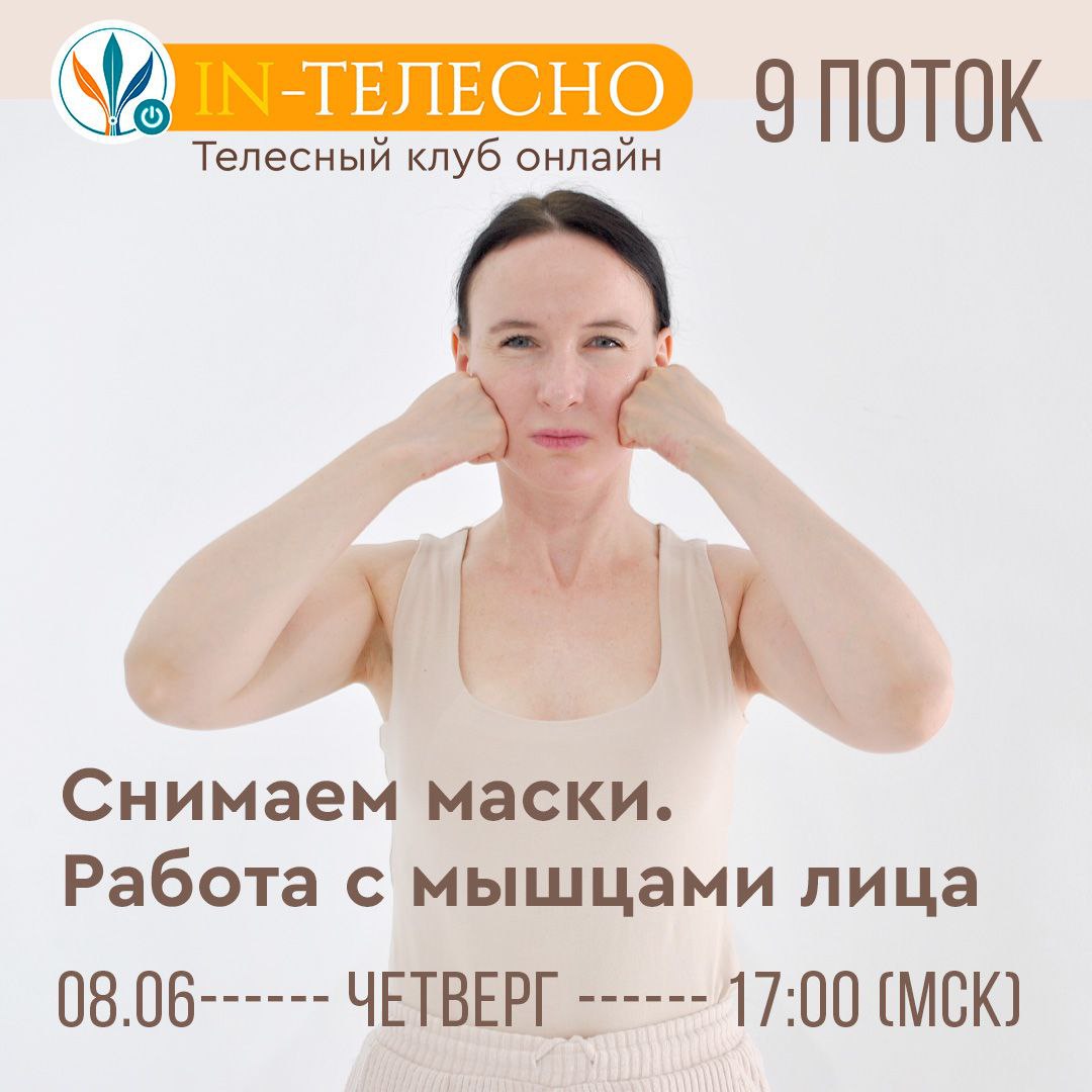 17.00 - 19.30 мск - Занятие клуба «IN-телесно». Тема: «Снимаем маски. Работа с мышцами лица» Ведущая – Елена Стыбаневич.