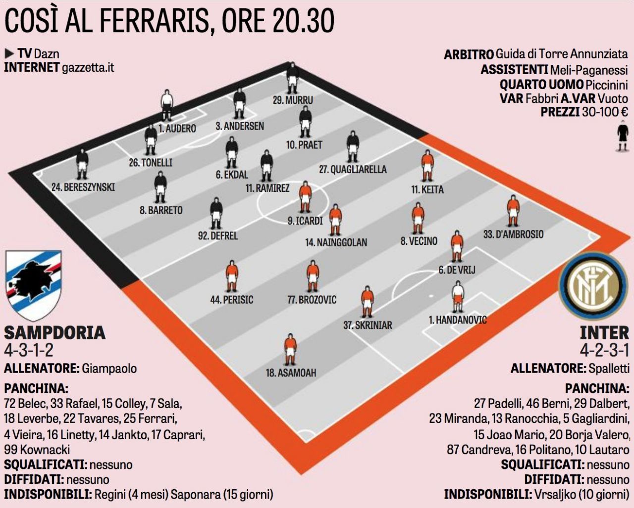 По мнению розовой газеты, у Интера в центре поля выйдет Весино, а на флангах Перишич и Кейта.