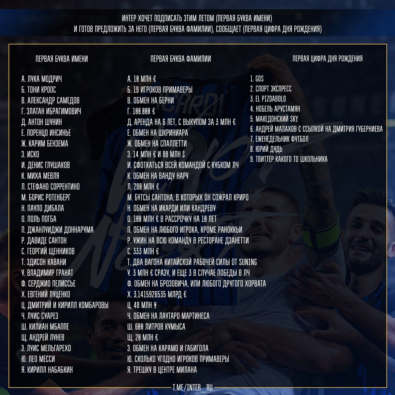 Листая ленту Твиттера или Вк натыкаешься на самые идиотские трансферные слухи связанные с Интером. Поэтому мы с одним из подписчиков создали для всех мамкиных инсайдеров и админов уникальный конструктор новостей.