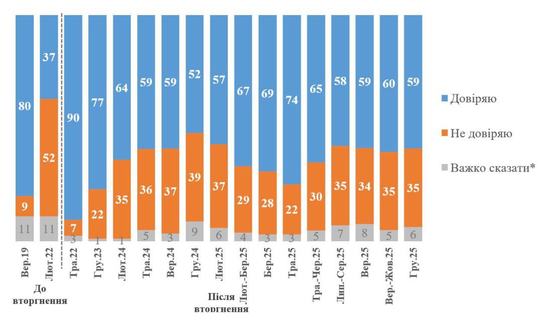 Водночас серед респондентів, опитаних 14-29 грудня, 55% висловили довіру Зеленському.