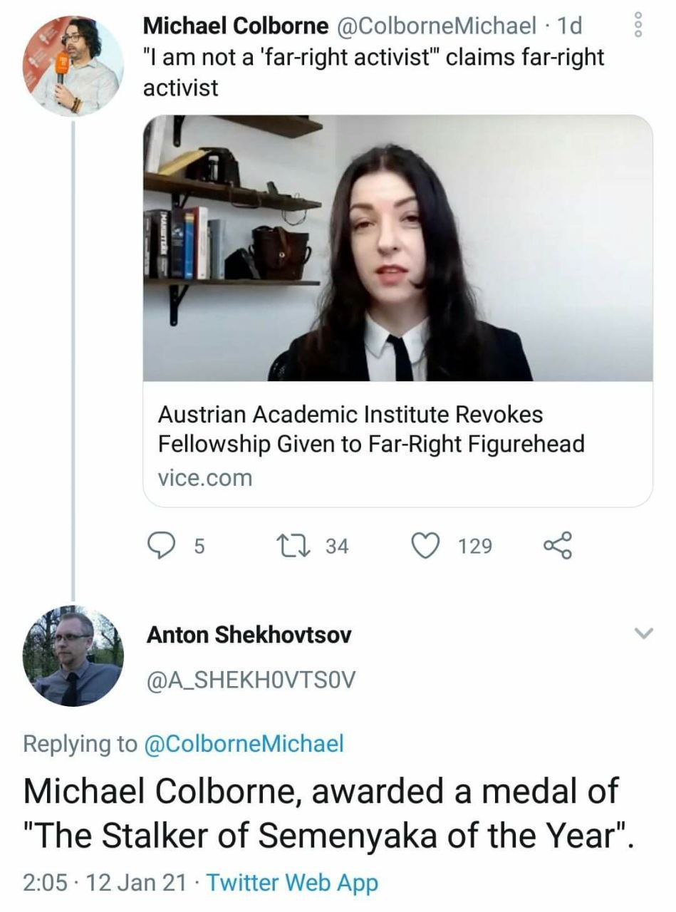 One would think that there is an abyss between ten-year-old politically incorrect jokes and political identification, “extremist activities” and shaping solidarity of “conservative” by modern standards Eastern and Central European countries in view of the Kremlin’s aggression. This difference, ideally, should have been a subject of promised investigation by the competent personnel of the IWM. But it never happened. Thus, although the biggest antiheroes in the entire story are the stalkers of yellow press like Michael Colborne who misquote Olena Semenyaka and distort her answers, and with a due respect for scientific merits of the senior colleagues, we consider it utterly anti-intellectual and non-pedagogical on the part of IWM to block the possibility of a dialogue and spread around the message of the “toxicity” of their own would-be fellow.