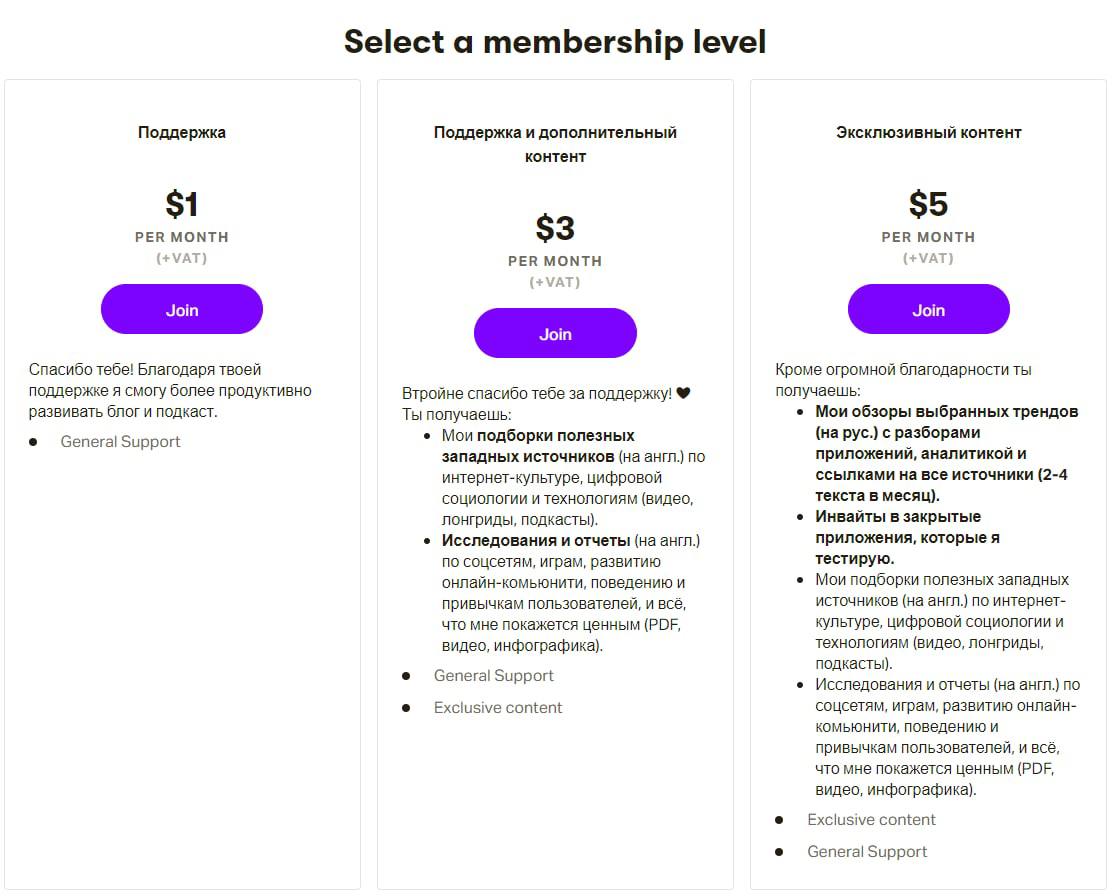 На Патреоне вы можете поддержать меня минимальной суммой $1 в месяц, а подписавшись за 3-5$ в месяц (+ НДС) вы получите доступ к эксклюзивному контенту (мои разборы трендов, инвайты в закрытые приложения, подборки крутых источников контента, отчетов и исследований, которые я использую при рисёрче и т.д.). Этот контент либо вообще не будет публиковаться в телеграм-канале, либо появится здесь очень нескоро. А еще там нет рекламы, зато есть комментарии, в которых я буду рад порубиться с вами.