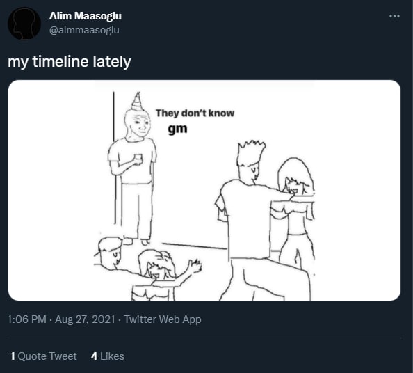 Сам по себе gm давно уже был в обиходе, но скорее в его прямом назначении — для пожелания доброго утра — и в контексте какой-то фразы. Локальный же мем gm возник, вероятнее всего, спонтанно и так же спонтанно умрет через несколько дней. Тем не менее, вчера кто-то уже запилил профиль для несуществующего приложения gm app — не исключено, что в понедельник нас ждут новости о 15-миллионной инвестиции от a16z.