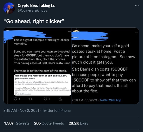 В конце октября один из таких NFT-товарищей обратил внимание на статью, где рассказывается как приготовить стейк как у Salt Bae (если помните такого турецкого шеф-повара из далекого 2017), но не за 1750 €, как у него в ресторане, а за 75. Такой подход он назвал типичным примером менталитета райт-кликеров, которые не понимают, за что обеспеченные люди переплачивают.