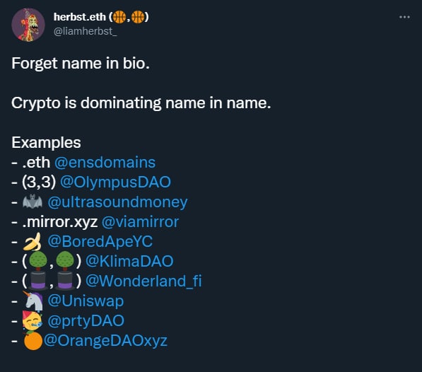 С популяризацией Web3 в этом году принадлежность к определенному коллективу разработчиков или DAO (организации, или скорее группы людей со схожими интересами, целями и общим крипто-кошельком) тоже стали сигнализировать с помощью профилей в Твиттере, добавляя после своего имени загадочные эмодзи, чаще всего в скобках.