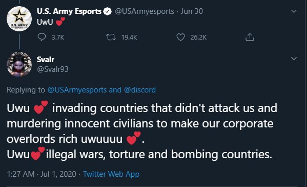 Естественно за этим последовала волна твитов указывающих на то, что U.S. Army Esports лицемерно привлекает молодое поколение геймеров вступать в армию, чтобы применять настоящее, а не виртуальное насилие.