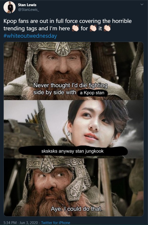 Примерно в это же время, в ответ на хештег #blacklivesmatter в Твиттере и Инстаграме стали появляться хештеги #alllivesmatter, #whitelivesmatter, #bluelivesmatter (blue, как цвет полицейской формы). Посты с этими хештегами дискредитировали протесты и движение BLM, в том числе публикуя расистские шутки и оскорбления. Но тут вмешались кейпоперы и хештеги точно так же утонули в мемах, гифках и видео с K-pop группами, став абсолютно неюзабельными.