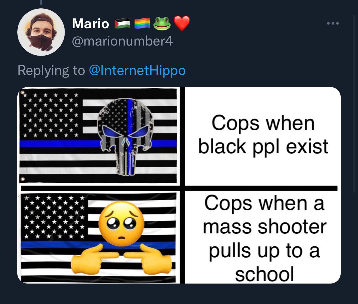 Теперь полиции припомнили буквально всё: и сторонников Blue Lives Matter, которые поддерживали полицейских, но теперь почему-то притихли; и то, как копы беззаботно расстреливают безоружных черных подростков, но не стреляют в белого подростка, чтобы самим не погибнуть.