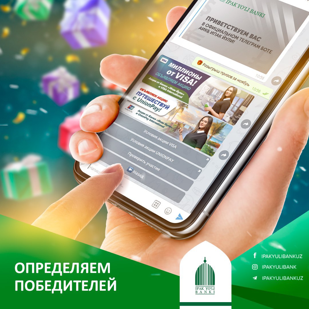 Сиз билан нафақат хуш кайфият🌝 ва фойдали молиявий 💰 хизматлар ҳақида ўртоқлашамиз, балки ажойиб совғалар ҳам илинамиз!