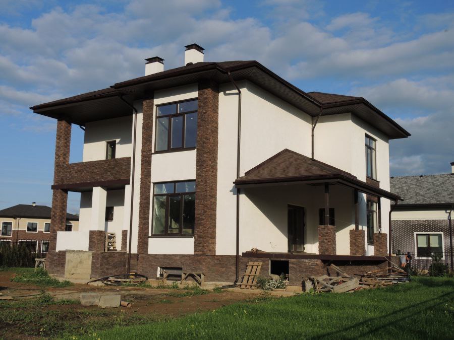 Дом строили для себя, монолитный, обложен красным кирпичом, утеплен базальтовой минеральной плитой 100 мм, отделка - фасадная штукатурка Мурексин и "рваный камень".