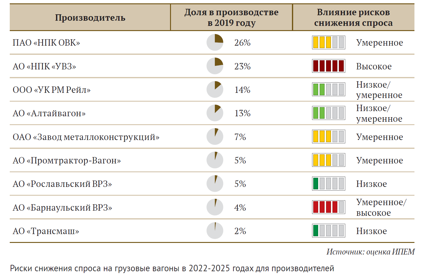 Иллюстрация: оценка влияния рисков снижения спроса на грузовые вагоны на ключевых производителей, ИПЕМ, 2019 год