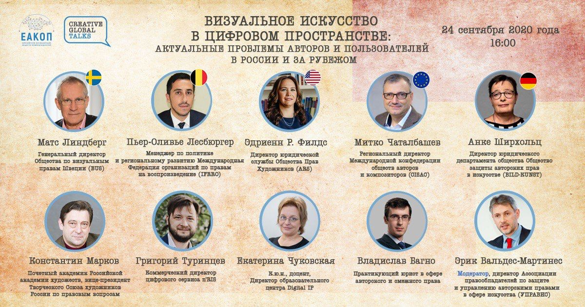 Уже через час начнется третья онлайн-встреча серии Creative Global Talks «Визуальное искусство в цифровом пространстве: актуальные проблемы авторов и пользователей в России и за рубежом», на которой представители творческих индустрий, а также эксперты в области права из России, Швеции, США, Франции, Германии, и Бельгии обсудят проблемы защиты прав на объекты изобразительного искусства и фотографии в условиях реалий цифровой экономики.