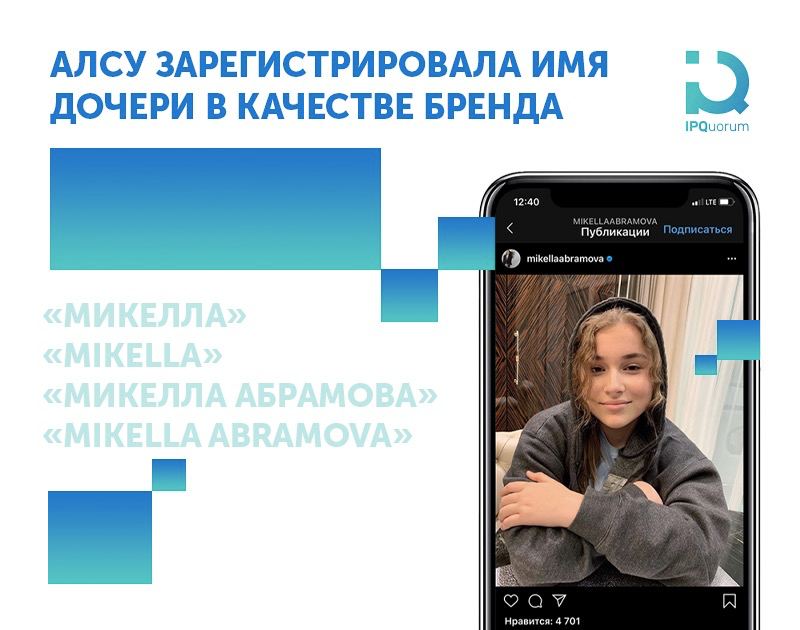 Заслуженная артистка России Алсу зарегистрировала несколько торговых марок для своей дочери Микеллы Абрамовой. Когда юная певица достигнет совершеннолетия, в качестве сценического имени, а также для рекламы и производства брендированной продукции она сможет использовать один из товарных знаков: «Микелла», «Mikella», «Микелла Абрамова» и «Mikella Abramova». Помимо «традиционных» для звезд парфюмерии, одежды и ювелирных изделий под именем Микеллы можно будет выпускать канцтовары и даже пиротехнику.