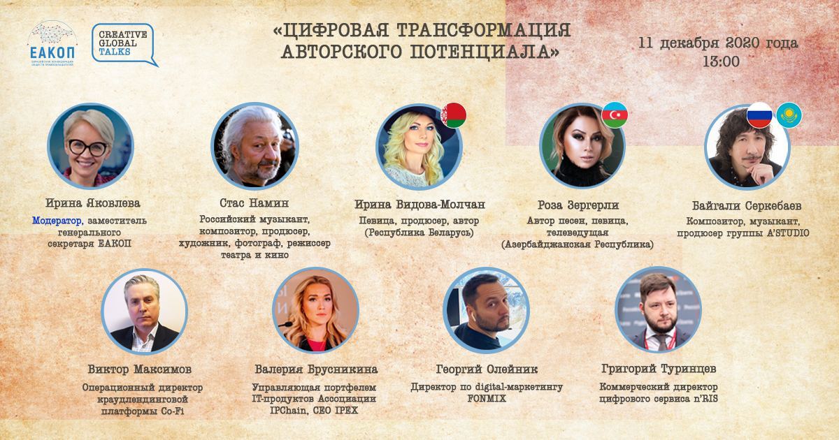 Серия встреч Creative Global Talks, организованная Евразийской конфедерацией обществ правообладателей (ЕАКОП), продолжится 11 декабря в 13:00 (время московское) обсуждением на тему «Цифровая трансформация авторского потенциала».