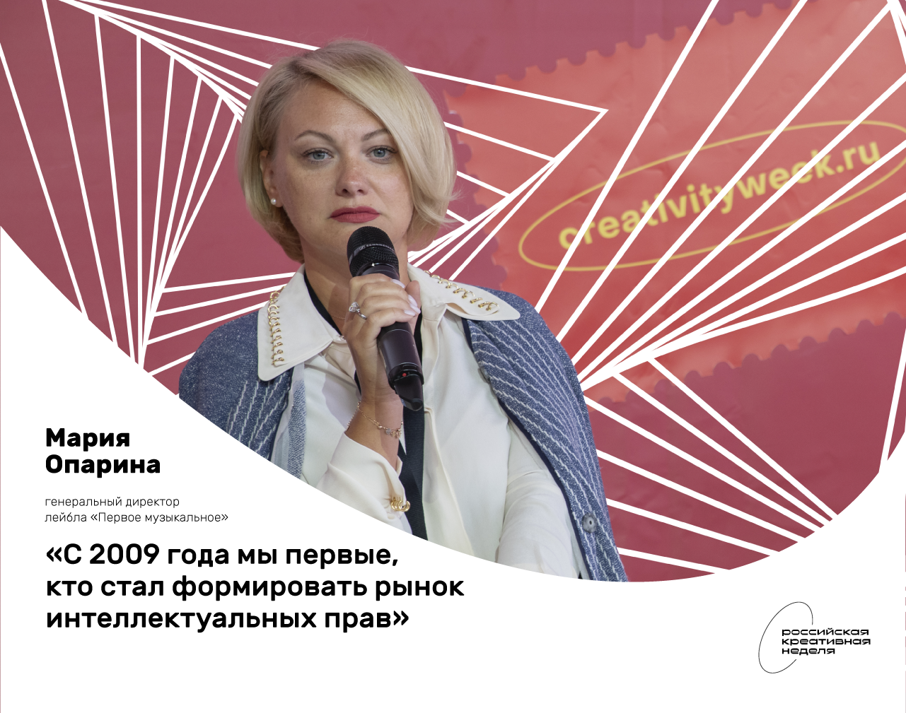 В рамках Российской креативной недели в Парке Горького состоялась сессия «25 лет лейблу „Первое музыкальное“». Генеральный директор «Первого музыкального» Мария Опарина рассказала о принципах работы с артистами, отличиях лейблов от продюсерских компаний, рецептах известности и каналах распространения контента.
