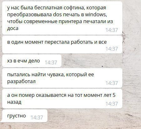 Лет 15 назад в одной конторе накидал софтину для автоматизации процесса, которая сильно облегчала мне жизнь. Можно было и без неё работать, но это бы тратило в день как минимум пару часов рабочих если задачу обрабатывать в ручную. Аналогов софтины не существует в природе в виду узкой специализации, которая кроме как в этой конторе врятли понадобится. Ушёл с той конторы давно, но тут недавно мне позвонили оттуда. И сообщили о том что моя софтина не работает под современными ОС. Просили помочь, за деньги, за большие. Но дело в том что исходников я не сохранил, и на программирование очень давно забил, да и желания вспоминать особенности работы той софтины совем нет, о чем текущим начальникам и сообщил. Пока держут отдельный древний комп с древней ОС(вин 2000, соответственно Иде хард с соответствующим железом), которая продолжает автоматизировать тот процесс. Других вариантов не придумали. Да, под виртуальной машиной софтина работать не будет, в виду специфичности оборудования, с которым она работает