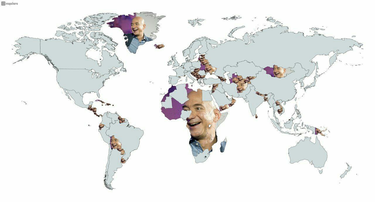 Kartadagi ayrim mamlakatlar AQShlik milliader Djeff Bezos surati bilan berilgan. U ana shu davlatlardan boyroq hisoblanadi.