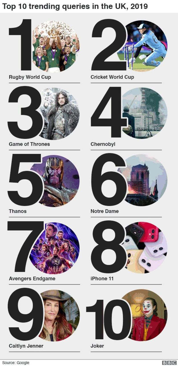 Britaniyada eng ko‘p qidirilgan 10 ta so‘rov ro‘yxatida telemahsulotlar, kino va sport o‘yinlari yetakchilik qildi. Kriket bo‘yicha Jahon chempionati, Chernobil va “Qasoskorlar: So‘nggi o‘yin” shular jumlasidandir.