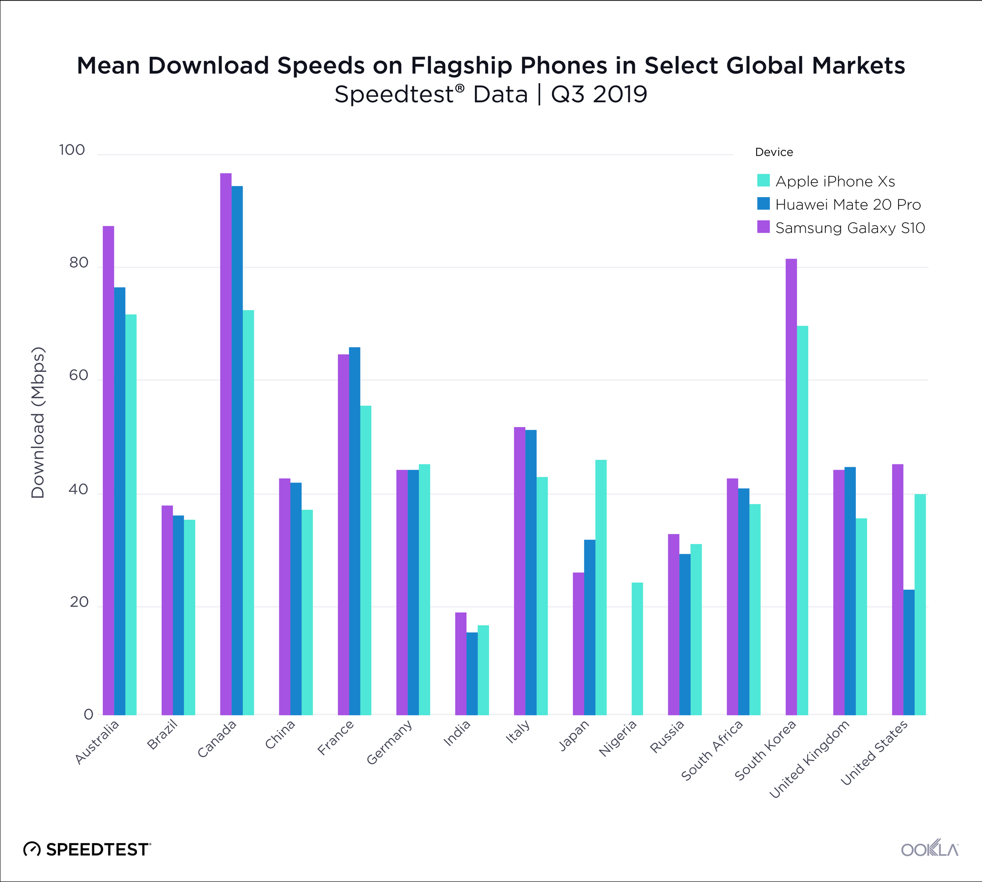 Maqola ostiga biriktirilgan diagrammada ko‘rib turganingizdek, Fransiya, Germaniya, Yaponiya, Nigeriya va Buyuk Britaniyadagina internetga kirish tezligi bo‘yicha Huawei Mate 20 Pro yoki iPhone XS ustunlikka erishgan. Nigeriyada faqat iPhone XS natijalari aks ettirilganiga sabab – bu mamlakat foydalanuvchilari Galaxy S10 va Huawei Mate 20 Pro flagmanlarida yetarli miqdorda Speedtest sinovini o‘tkazib ko‘rishmagan.