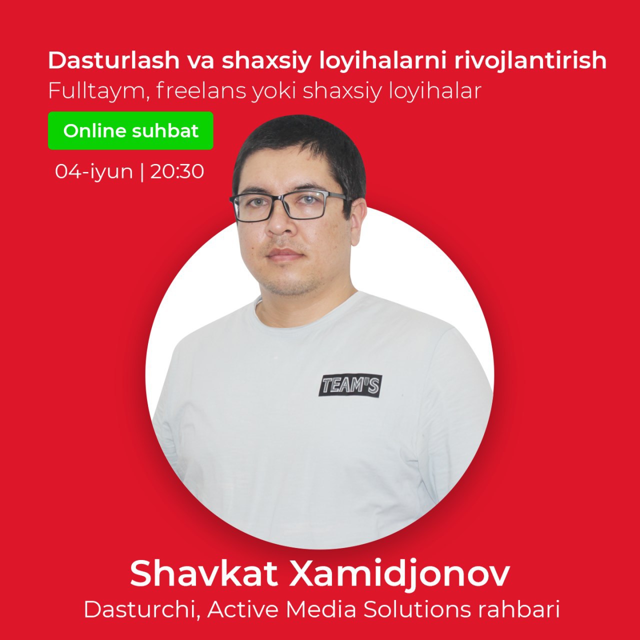 🔴 4-iyun kuni 20:30da Active Media Solutions rahbari, bir necha shaxsiy loyihalar muallifi, dasturchi Shavkat Xamidjonov bilan online suhbatni tomosha qiling!