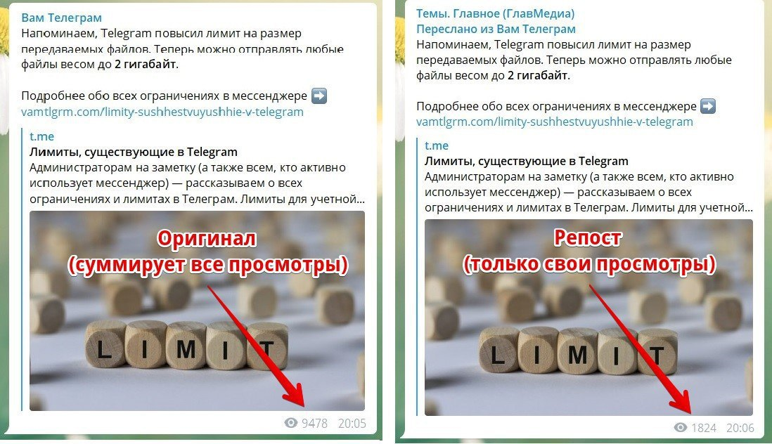 O‘zgarish ma’lum kanaldagi postlarni boshqa kanallarda ulashish (repost) bilan bog‘liq. Endi repostni amalga oshirgan kanal faqat o‘zidagi ko‘rishlar sonini aks ettiradi. Manba kanali esa umumiy “ko‘zchalar” yig‘ingisini hosil qiladi.