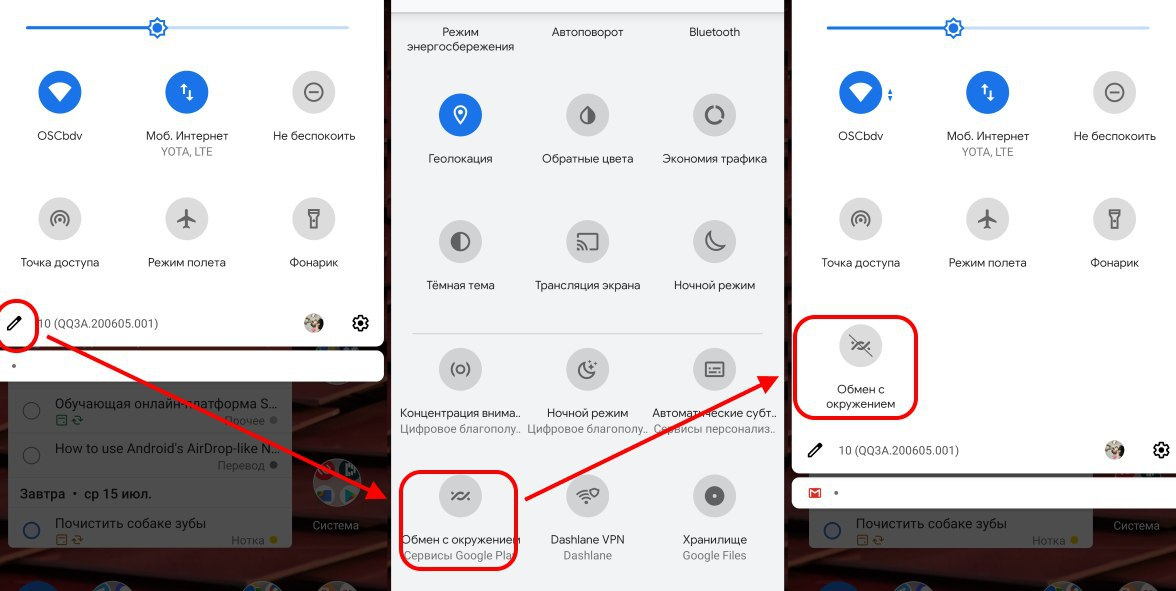 3️⃣. Google -> Qurilma ulanishlari (Подключения устройства) -> Yaqin-atrofga yuborish (Обмен с окружением) -> Yoqish (Включить)ni tanlang.