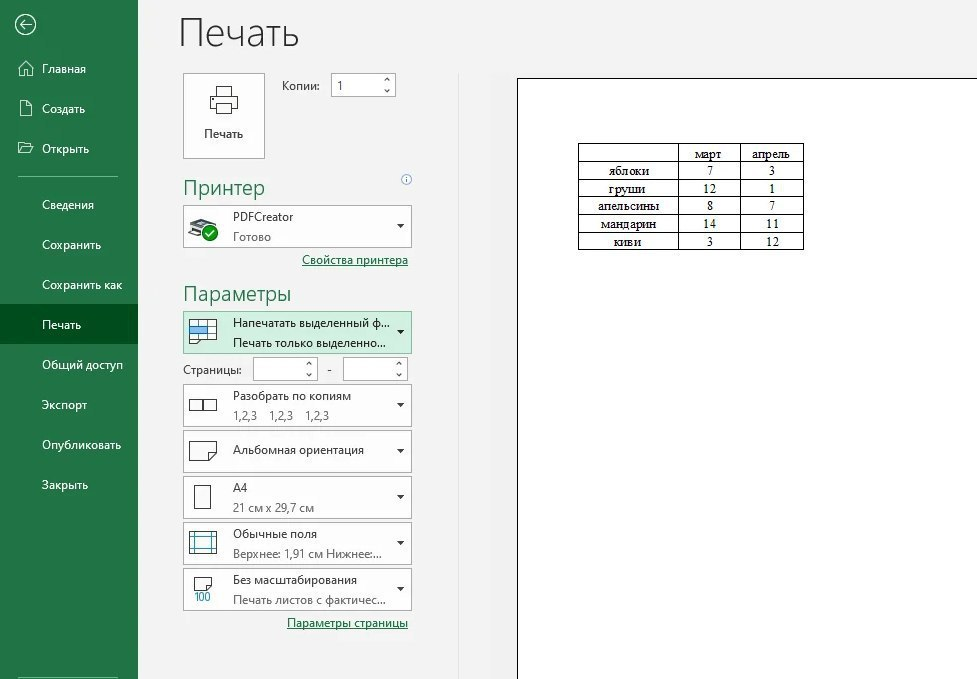 Ma’lumotlarning kerakli diapazonini belgilaymiz va Файл → Печать bo‘limiga o‘tamiz.