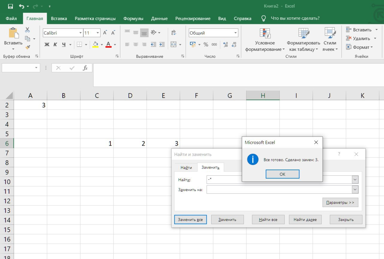 CTRL + H (Найти и заменить) klavishlari birikmasini bosish, so‘ngra Найти maydoniga “-*”ni (qo‘shtirnoqlarsiz) kiritish, Заменить на maydoniga esa — 0 ni kiritish yoki ushbu maydonni bo‘sh qoldirish va Заменить все tugmasini bosish lozim.Natijada manfiy qiymatli barcha yacheykalar 0 ga almashtiriladi yoki mos tarzda, — o‘chiriladi.