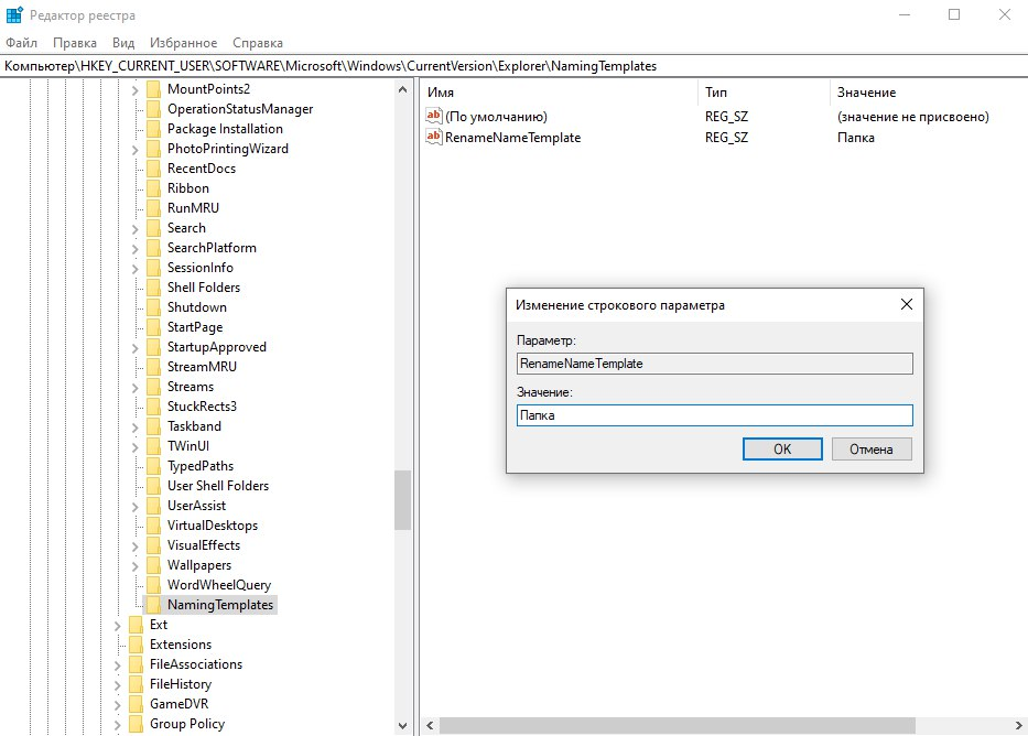 Papka qoida bo‘yicha yaratilganida unga “Новая папка” nomi beriladi. Biz reyestrni tahrirlash orqali qoida bo‘yicha beriluvchi nomlanishni o‘zgartirishimiz mumkin.