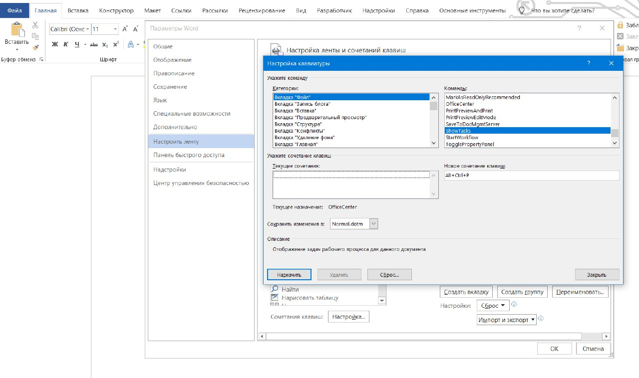 Menyu satrining Файл varaqa (вкладка)si → Параметры → Настроить ленту → Сочетания клавиш bo‘limiga o‘ting. Kerakli buyruq uchun tegishli bo‘lgan kategoriyani tanlang.