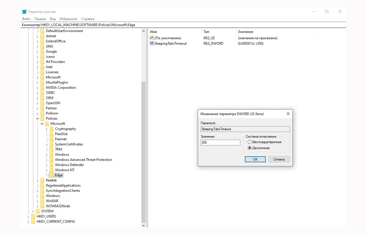 regedit buyrug‘ini kiritasiz va Enter klavishini yoki oynachadagi “OK” tugmasini bosasiz) va ushbu yo‘nalish bo‘ylab o‘ting:Компьютер\HKEY_LOCAL_MACHINE\SOFTWARE\Policies\Microsoft\Edge.Agar Edge quyi bo‘limi mavjud bo‘lmasa, unda uni Microsoft papkasi ustiga sichqonchaning o‘ng tugmasini bosib, ochilgan menyudan yangi quyi bo‘limni qo‘shish orqali yarating. So‘ngra SleepingTabsTimeout nomli DWORD (32-bit) parametrini yarating.