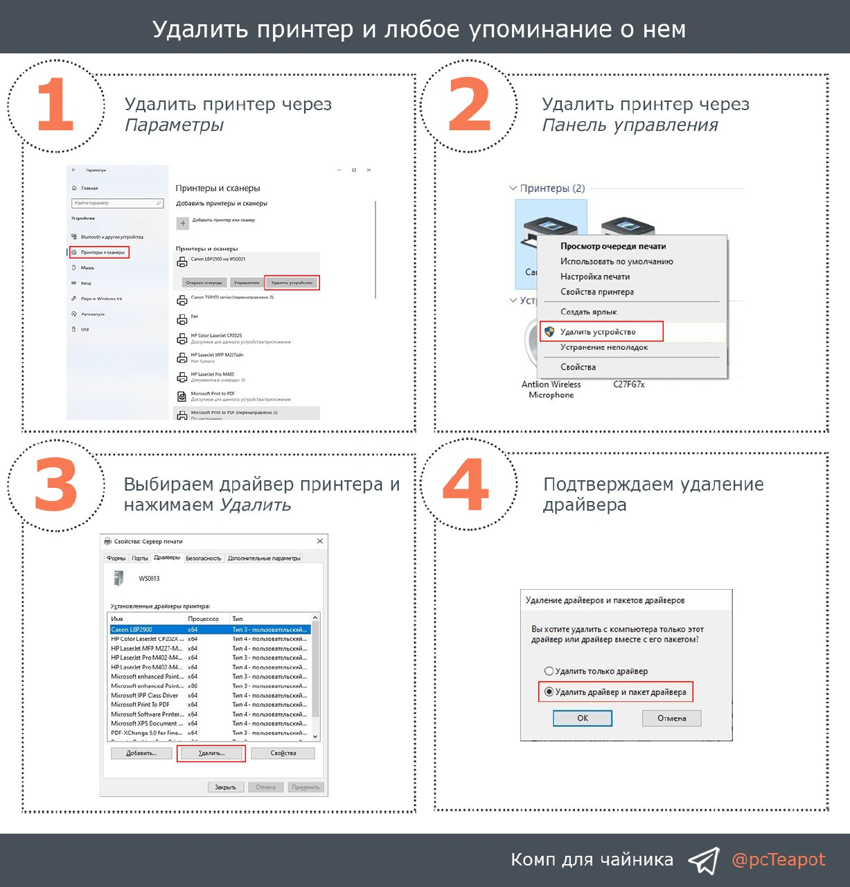 WIN + R birikmasini bosamiz va ochilgan Выполнить oynasiga printui /s /t2 buyrug‘ini kiritib ENTER'ni bosamiz. Драйверы varaqa (вкладка)sida printerning drayverini belgilaymiz va Удалить tugmasiga bosamiz.Keyingi oynada Удалить драйвер и пакет драйвера'ni tanlaymiz va OK'ga bosamiz.