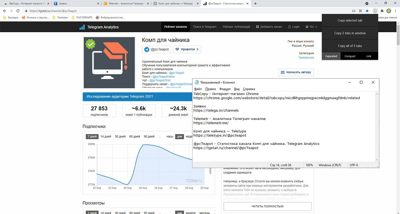 Google Chrome brauzerida ochilib turgan sahifalarning barcha sarlavhalari va manzillarini nusxalab olish uchun TabCopy kengaytmasidan foydalanish mumkin.
