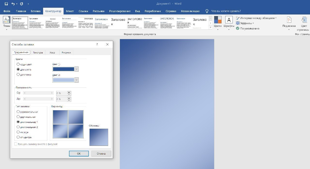 Buning uchun menyu satrida Конструктор → Цвет страницы → Способы заливки bandlari bo‘ylab o‘ting. Ushbu oynada siz gradiyent, tekstura yoki naqshni tanlay olasiz. Sozlangan parametrlar hujjatdagi barcha sahifalarga nisbatan qo‘llaniladi.