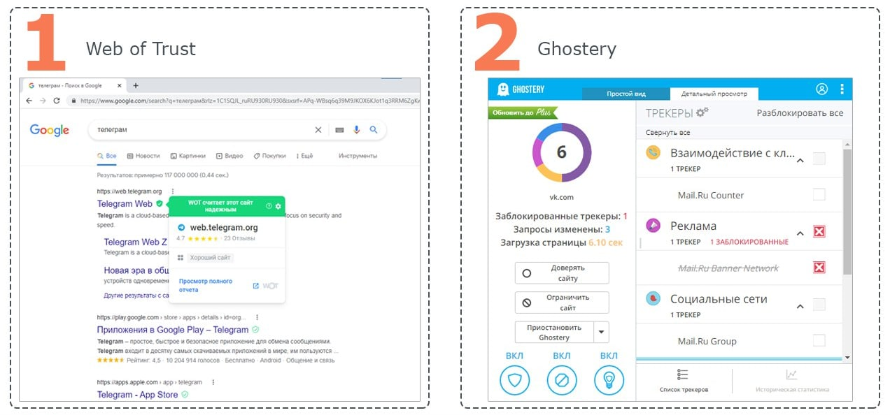 Web of Trust — ishonchli saytlarni yashil belgi va ishonchsizlarini – qizil belgi bilan belgilaydigan mashhur kengaytma. U tashrif buyurilgan sahifalar haqida foydalanuvchilarning fikr-mulohazalari asosida ishlaydi. Chrome, Firefox va Opera brauzerlari uchun mavjud.