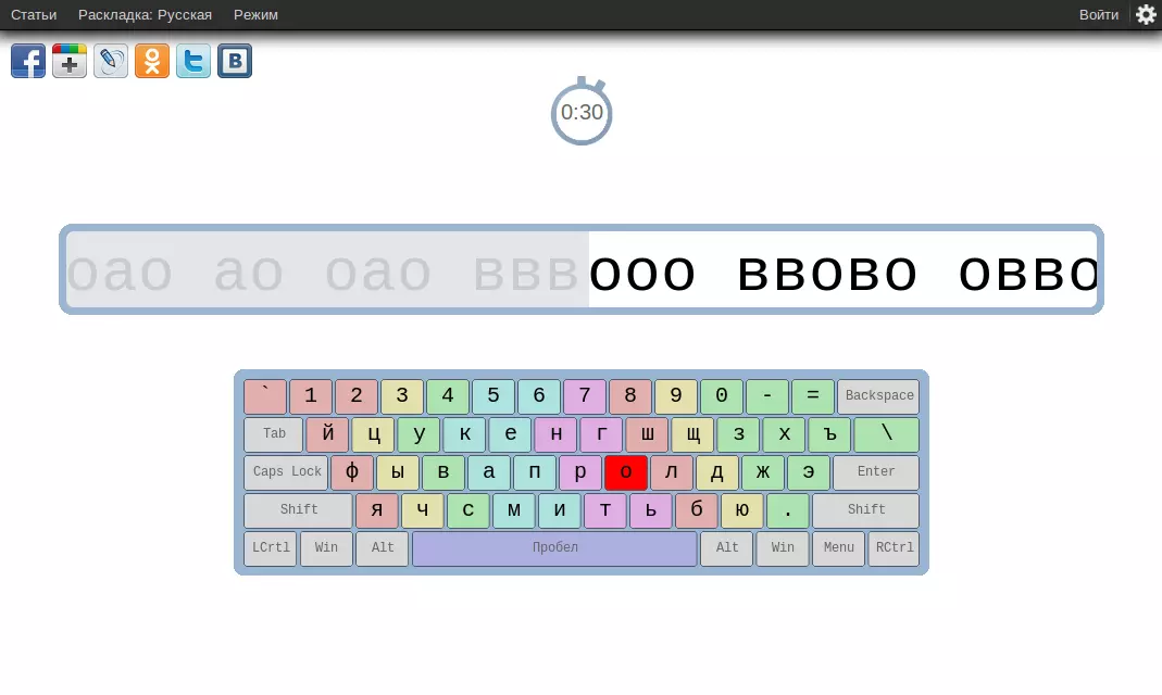 Probel klavishiga bosamiz va ekrandagi harflarni kiritamiz — keyinchalik so‘zlar ham boshlanadi. Bir necha daqiqadan so‘ng kiritiluvchi simvol (belgi)lar tugaydi va foydali statistikaga guvoh bo‘lasiz: kiritilgan belgilar soni, bir daqiqada kiritilgan belgilar soni va xatoliklar foizi.