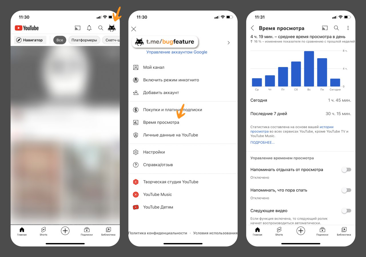Ilovada sarflangan ekran vaqtini kuzatish uchun YouTube ilovasini oching, yuqori chap burchakda aylanali akkaunt belgisi ustiga bosing va undagi “Время просмотра” bandini tanlang. Tomosha qilishga sarflagan vaqtingiz jadvali keltirilgan sahifaga o‘tasiz.