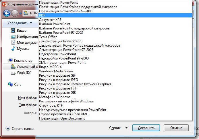 2️⃣. MS PowerPoint'ning o‘zida. Taqdimot fayli tayyor holga kelganidan so‘ng odatiy harakatlar bajariladi: Menyu satridagi “Файл” varaqa (вкладка)siga o‘tib, “Сохранить как” bandi tanlanadi. Fayl nomi ostidagi ochiluvchi ro‘yxatdan standart “PPTX/PPT” formatining o‘rniga pastroqdagi “PDF” formati tanlanadi.